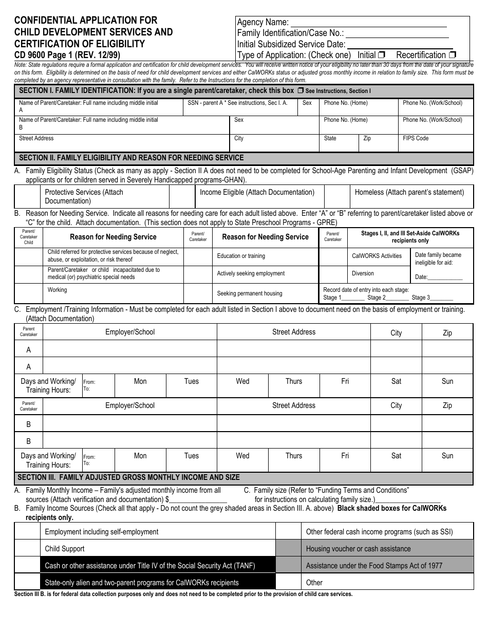 Form Cd9600 Download Fillable Pdf Or Fill Online Confidential Application For Child Development Services And Certification Of Eligibility California Templateroller